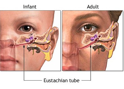 Eustachian tube dysfunction can lead to discomfort when flying.The middle ear is an air-filled space separated from the external ear by the tympanic membrane (ear drum). The Eustachian tube connects the middle ear space to the nasopharynx at the back of the nose. It normally opens with swallowing or yawning and allows equalization of pressure in the middle ear.